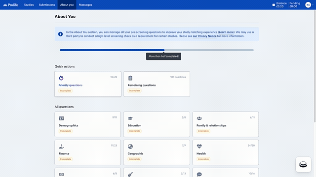 'About You' is where you manage pre-screening questions that match you with appropriate studies. Researchers use these answers to find participants who meet their specific criteria (e.g., Spanish residents aged 18-75 who follow a vegetarian diet).